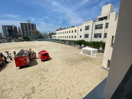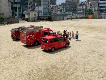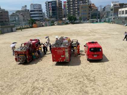 1年生と2年生が、消防車などの車両見学と煙ハウスの体験です。