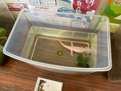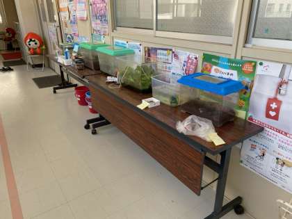 夏休みに入り、各学級の小動物は、職員室前に集まっています。