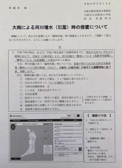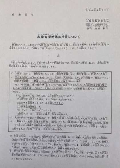 台風情報に関して、学校から4月と5月に配付しましたお手紙です。