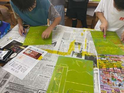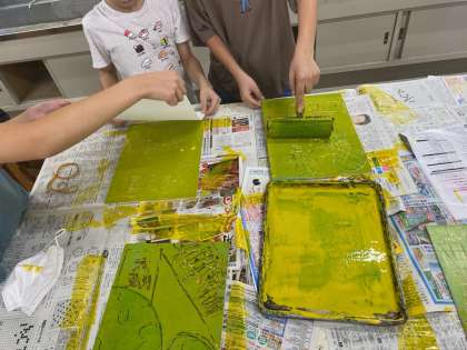 5年生は、保護者の方にお手伝いいただき版画を刷る作業。