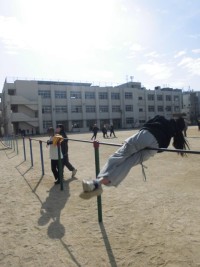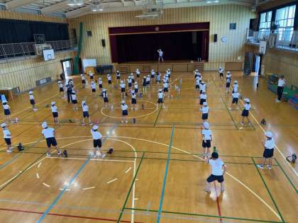 この写真は、1・2年生の団体演技の練習風景です。