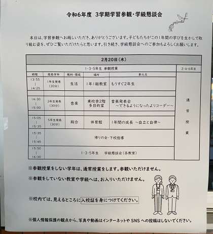 20日の学習参観の予定 公開日 2025/02/20 更新日 2025/02/20 学校行事 本日、午後から学習参観です。 子どもたちは、準備をして待っています。 暖かくしてお越しください。 なお、個人情報保護の観点から、写真や動画の SNSやネット等への投稿はおやめください。 いいね(0)