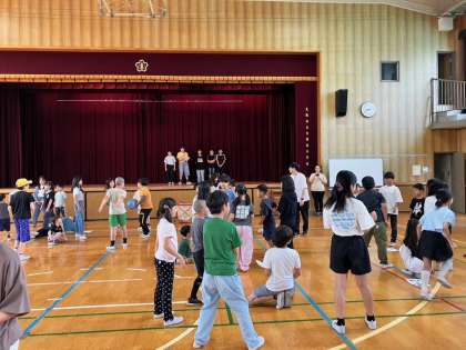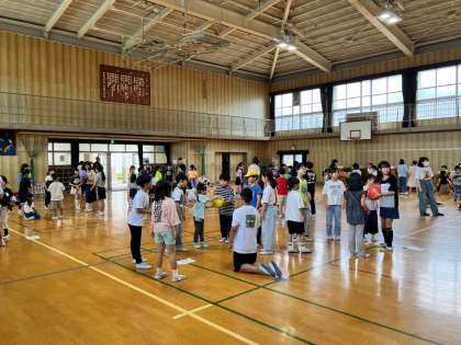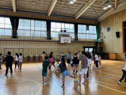 なかよし班ごとに円になり、音楽が鳴っている間、ボールを回します。
