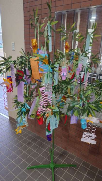 玄関に、1年生が作成した七夕飾りを展示しています。