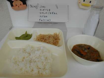 今日の献立は、【ごはん、マーボーなす、もやしのごま酢あえ、枝豆、牛乳】でした。