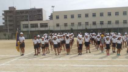 本日1限目は、運動会の全体練習を行いました。入場行進や開閉会式の練習をしました。みんなが元気よく見えるために、腕は後ろを意識して、しっかり振る。下を見ずに前をしっかり見る。この2点を注意しましょう。と話をしました。
