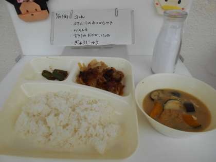 9月15日の給食 公開日 2017/09/15 更新日 2017/09/15 お知らせ 今日の献立は、【ごはん、豚肉の甘辛焼き、みそ汁、オクラのおかかいため、牛乳】でした。 豚肉の甘辛焼きは、ごはんによく合う味で、どのクラスでも「おいしい!おいしい!!」と大人気でした。 みそ汁にかぼちゃとなす、もう1品にオクラで、夏野菜たっぷりの献立でした。 いいね(0)