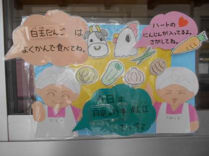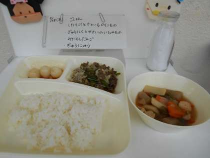 今日は月見の行事献立で、【ごはん、鶏肉とさといもの煮もの、牛肉と野菜のいためもの、みたらしだんご、牛乳】でした。