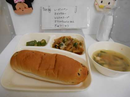 今日の献立は、【レーズンパン、ホイコウロー、とうふのスープ、オクラの中華あえ、牛乳】でした。