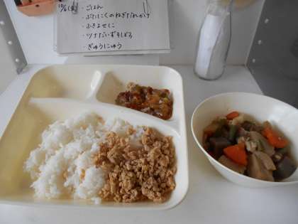 今日の献立は、【ごはん、豚肉のねぎだれかけ、ふきよせ煮、ツナ大豆そぼろ、牛乳】でした。