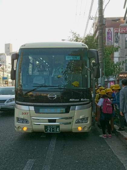 エバグリーンのマンションの前にバスがきています。大きな荷物をトランクに積みこんだら、いよいよ出発です。絶好の修学旅行日和です。家族のみなさん「行って来ま〜す!」
