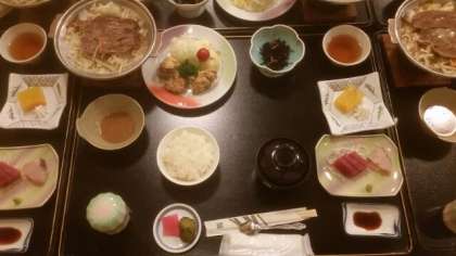 これが一人前です。とうばん焼きに唐揚げ、お刺身・ヒジキの煮物・茶碗蒸し・デザートと豪華なメニューです。いただきますの挨拶の後、早速舌鼓をうちました。