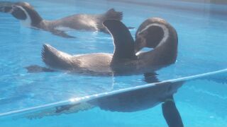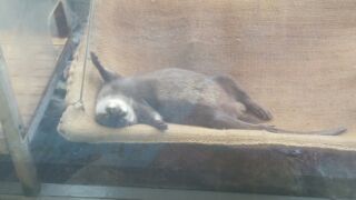 コツメカワウソのダレタ様子、ペンギンの泳ぎっぷりです。