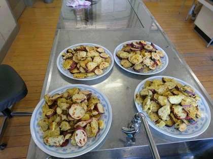 2年生では、学習園でさつまいもを育ててきました。今年も沢山のおいもが収穫できたので、今日の2時間目、3時間目に家庭科室で1年生を招待しておいもパーティーを行いました。2年生から1年生にランチマット風の招待状を送っていました。ホットプレートで焼いたさつまいもをみんなでおいしくいただきました。