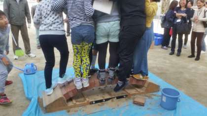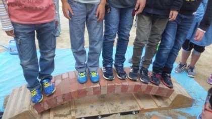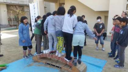 それではとみんなで乗ってみよう!と男子5名がチャレンジしました。びくともしません。次に女子全員プラス先生です。アーチはぜんぜん平気です。どぼくの素晴らしさにみんな納得です。