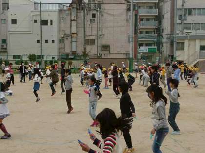 本校では、児童の体力を高めることを年間を通じて取り組んでいます。今日から12月1日(金)までの2週間、なわとび週間がはじまりました。2時間目後の15分休みに、全児童が運動場に集って、いろいろな跳び方をリズムに合わせて練習していきます。