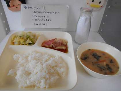 今日の献立は、【ごはん、赤魚のしょうゆだれ、なめこのみそ汁、はくさいのごまあえ、牛乳】でした。