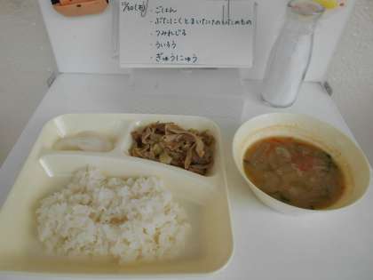 今日の献立は、【ごはん、豚肉とまいたけのいためもの、つみれ汁、ういろう、牛乳】でした。