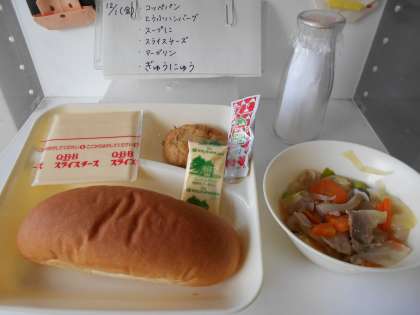今日の献立は、【コッペパン、とうふハンバーグ、スープ煮、スライスチーズ、マーガリン、牛乳】でした。