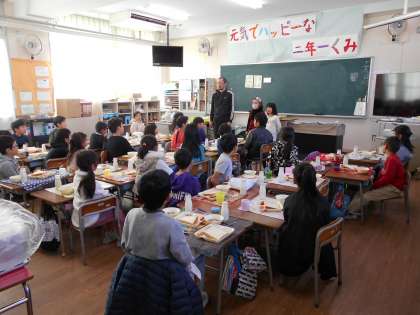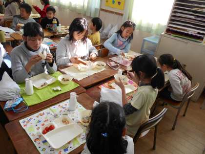 いつもとちがう顔ぶれで食べる給食は一味ちがうようで、ドキドキわくわくした給食時間となりました。どのクラスも残さずきれいに食べていました。