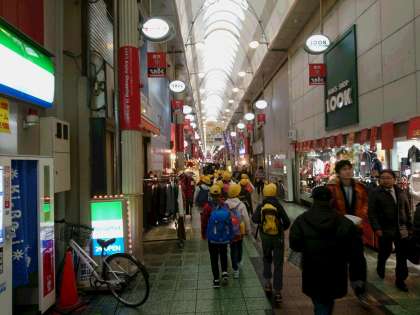・大阪くらしの今昔館での見学の後、すぐそばにある天神橋筋商店街の見学をしました。この商店街は、大阪でも一・二を競うぐらい長い商店街で、たくさんのお店があり、たくさんのお客さんが行き来していて、とても活気のある商店街です。