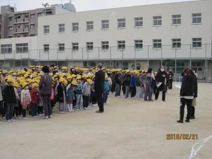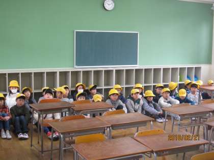 本日2時間目に、地震に対する避難訓練を全校児童で行いました。まず、揺れが生じた時すばやく机の下にかくれて身を守り、揺れが収まったら運動場に避難することを行いました。