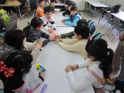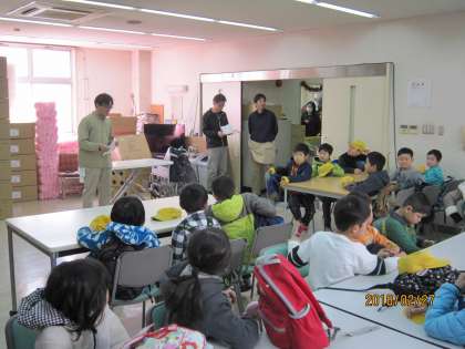 その後、実際に作業所内を案内していただき、仕事をしているようすを見学しました。見学が終わった後、部屋でビンゴゲームをしました。これもあそびテーションといって、体をならすひとつの訓練だそうです。