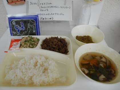今日は卒業祝い献立で、【手巻きご飯(牛肉の甘辛煮、ツナソテー)、すまし汁、和なしのまっ茶クランブル、牛乳】でした。