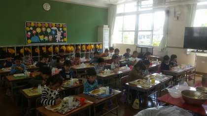 1年生にとって小学校に入学して初めての給食です。6年生が当初は給食室から教室まで運んでくれます。