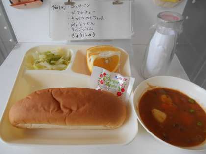今日の献立は、【コッペパン、ビーフシチュー、キャベツのピクルス、甘夏かん、りんごジャム、牛乳】でした。