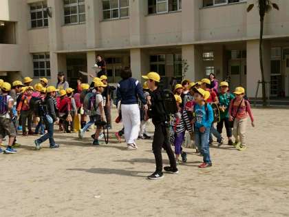 その後、地区ごとに運動場に集まって、担当の先生の指示にそって、集団下校の練習をしました。どの班も二列でしっかりと道路を歩き家まで帰ることができました。