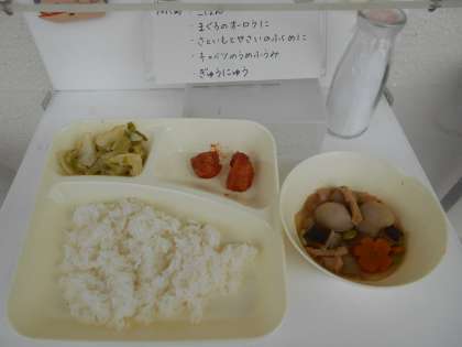 今日の献立は、【ごはん、まぐろのオーロラ煮、さといもと野菜の含め煮、キャベツの梅風味、牛乳】でした。