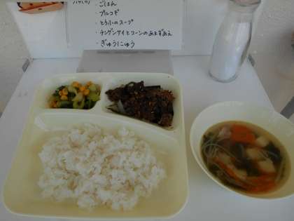 5月14日の給食 公開日 2018/05/14 更新日 2018/05/14 お知らせ 今日の献立は、【ごはん、プルコギ、とうふのスープ、チンゲンサイとコーンのサラダ、牛乳】でした。 1年生に「プルコギって何?」と聞かれたので、「みんなの住んでる国は何という国かな?」「日本の隣りに韓国という国があって、その国の料理だよ」という話をしました。給食が他国の食文化を知るきっかけとなり、嬉しかったです。 いいね(0)