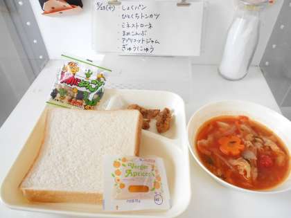 5月23日の給食 公開日 2018/05/23 更新日 2018/05/23 お知らせ 今日の献立は、【食パン、一口トンカツ、ミネストローネ、豆こんぶ、アプリコットジャム、牛乳】でした。 一口トンカツは、給食室で下味をつけて衣付けをした、手作りのカツでした。大人気で、5年生ではクラスの児童の半分が、おかわりのじゃんけん大会に参加していました。 いいね(0)