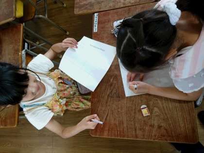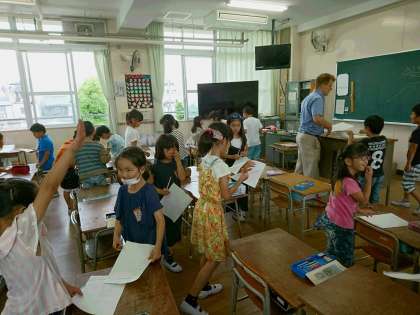 ビンゴカ−ドをひとりずつもって、自己紹介を英語でしあって、うまくできたら相手の名前を自分のビンゴカードに書きためていくゲームです。みんな元気に動き、「Hallow!」「My name is 〇〇」と会話をやっていました。