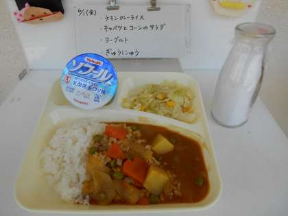 今日の献立は、【チキンカレーライス、キャベツとコーンのサラダ、ヨーグルト、牛乳】でした。