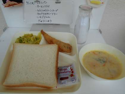 今日の献立は、【食パン、サーモンフライ、豆乳コーンスープ、キャベツのカレーソテー、いちごジャム、牛乳】でした。