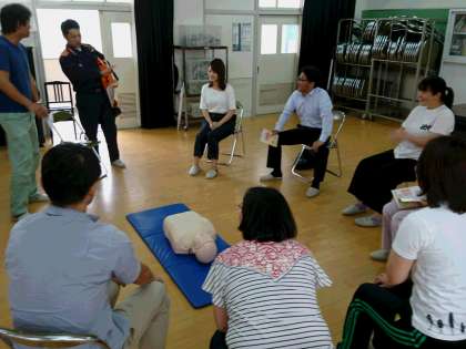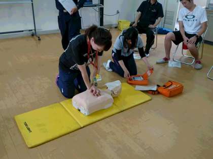 住之江消防署の方から、一次救命処置として、胸骨圧迫の方法とAEDの使い方を実際に体験しました。
