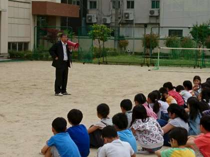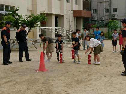 出火が起こった時に素早く避難行動をとる練習をしました。運動場に集まってからは、校長先生の話の後、高学年の人が、水消化器の使い方を練習しました。