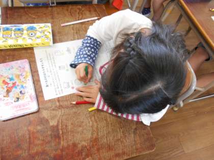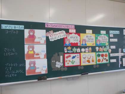 まず「3びきのこぐま」の紙芝居を通して、赤・黄・緑それぞれグループのはたらきと食べものを学習しました。そして、今日の給食に入っている食べものを児童に色分けしてもらい、給食は赤・黄・緑がそろっていることを確認しました。まとめとして、赤・黄・緑3色そろうことで元気に活動することができるということ、3色そろえるために好ききらいしないで食べようということを伝えました。