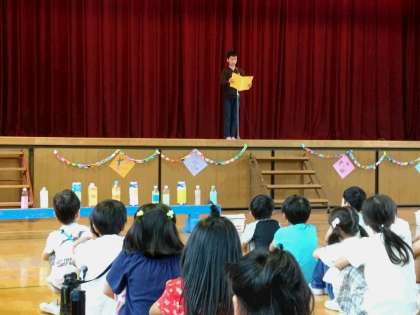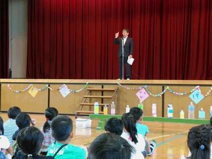 代表委員会の人からの開会のことばの後、校長先生からお店係の気持ちの持ち方やグループでお店めぐりをする時の心がまえをお話していただきました。