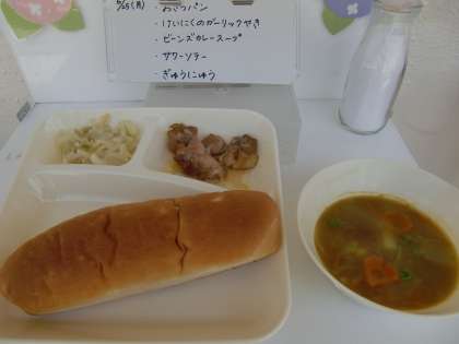 今日の献立は、【おさつパン、鶏肉のガーリック焼き、ビーンズカレースープ、サワーソテー、牛乳】でした。