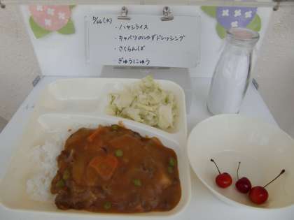 6月26日の給食 公開日 2018/06/26 更新日 2018/06/26 お知らせ 今日の献立は、【ハヤシライス、キャベツのゆずドレッシング、さくらんぼ、牛乳】でした。 生のさくらんぼは、年に1回だけ6月に登場します。 低学年では、「今日の給食ぜーんぶ好き!」の声が聞こえました。 いいね(0)