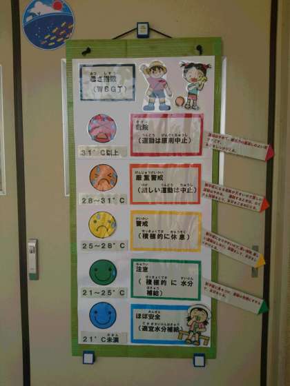 北粉浜小学校では、教育委員会から発表される「暑さ指数」に基づき、子ども達の健康管理に努めています。指数につきましては、1階保健室前に掲示しております。保護者のみなさまもごらんいただき、参考にしていただけたらと思います。