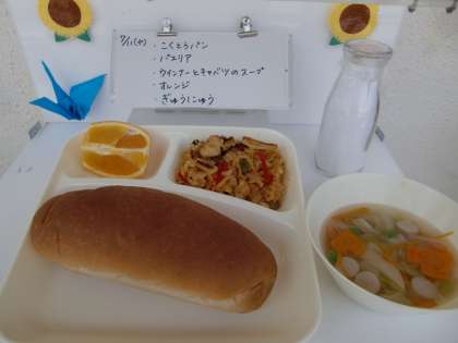 今日の献立は、【黒糖パン、パエリア、ウインナーとキャベツのスープ、オレンジ、牛乳】でした。