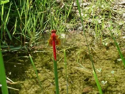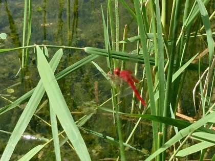 ビオトープの整備をしていたら7月頃から頭から尾っぽまで、すごく真っ赤なトンボが飛んでいたので「すごく赤いアキアカネだな」と思っていたのですが・・・