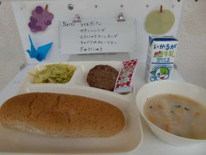 今日の献立は、【ライ麦パン、焼きハンバーグ、豆乳コーンスープ、キャベツのカレーソテー、牛乳】でした。