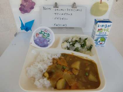 今日の献立は、【チキンカレーライス[米粉]、野菜のピクルス、ぶどうゼリー、牛乳】でした。
