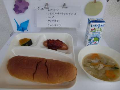 今日の献立は、【おさつパン、フランクフルトのケチャップソース、スープ、焼きかぼちゃ、牛乳】でした。