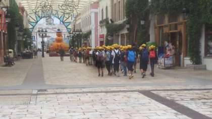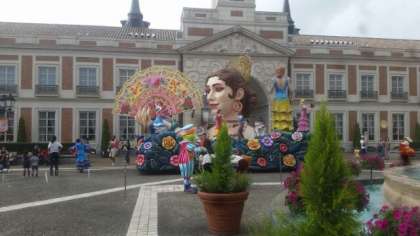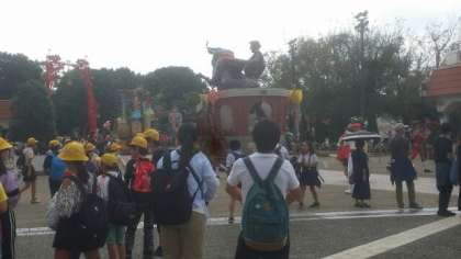 パルケ・エスパーニャに入場するとちょうどパレードの時間でした。パレードの車を背景に、集合写真を撮りました。